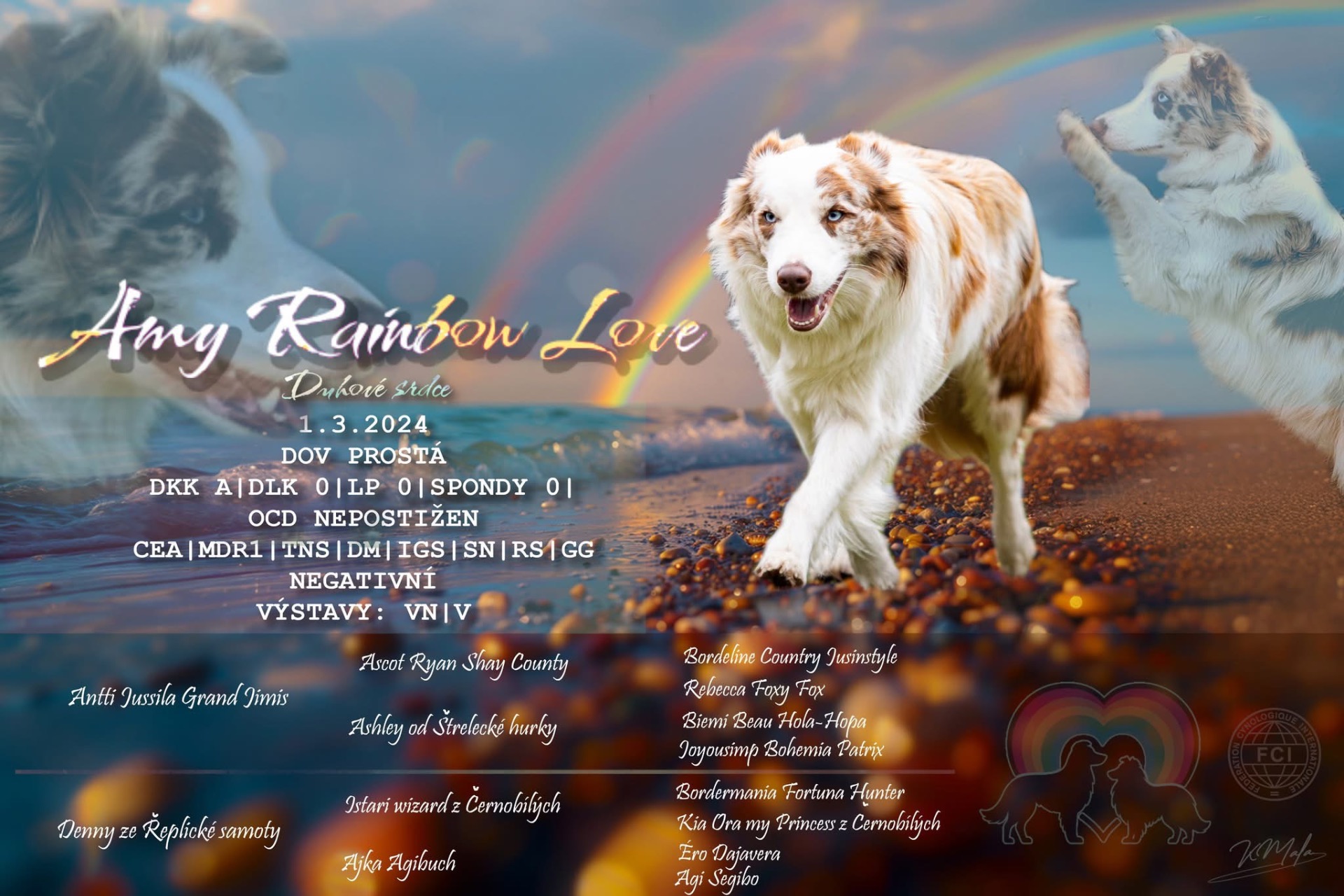 Amy je momentálně nejmladší členkou naší smečky. Je to milá, velmi výrazně vybarvená psí slečna. Zatím se společně účastníme výstav, rekreačně a především pro radost se věnujeme také canicrossu.