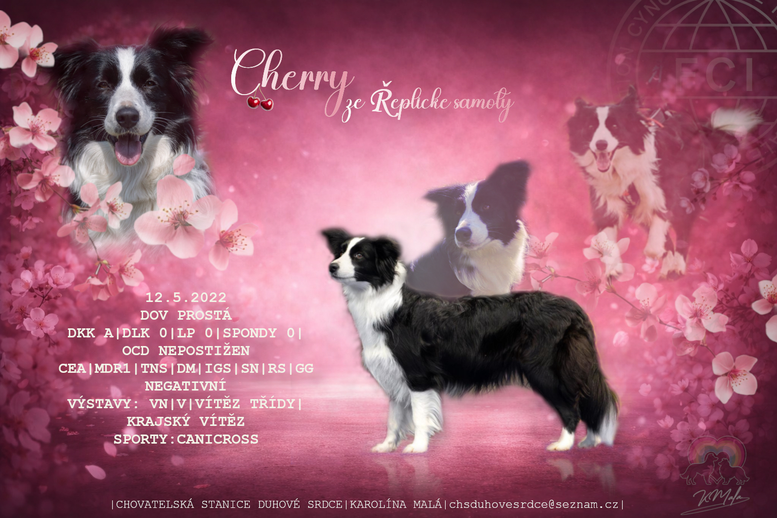 Cherry je naším odchovem, jedná se o dceru Denny. Je to akční, inteligentní mladá fena, která pro svého pána udělá cokoliv, aby mu udělala radost. Její drobnou neduhou je žárlivost, která se projevuje v přítomnosti cizích psů, přece panička by měla věnovat veškerou svou pozornost jenom jí jediné :) Na nápravě soustavně pracujeme, tak třeba se nám z věkem podaří tato vlastnost odbourat, jinak jí totiž není co vytknout, je to typická border kolie povahou i vzhledem.